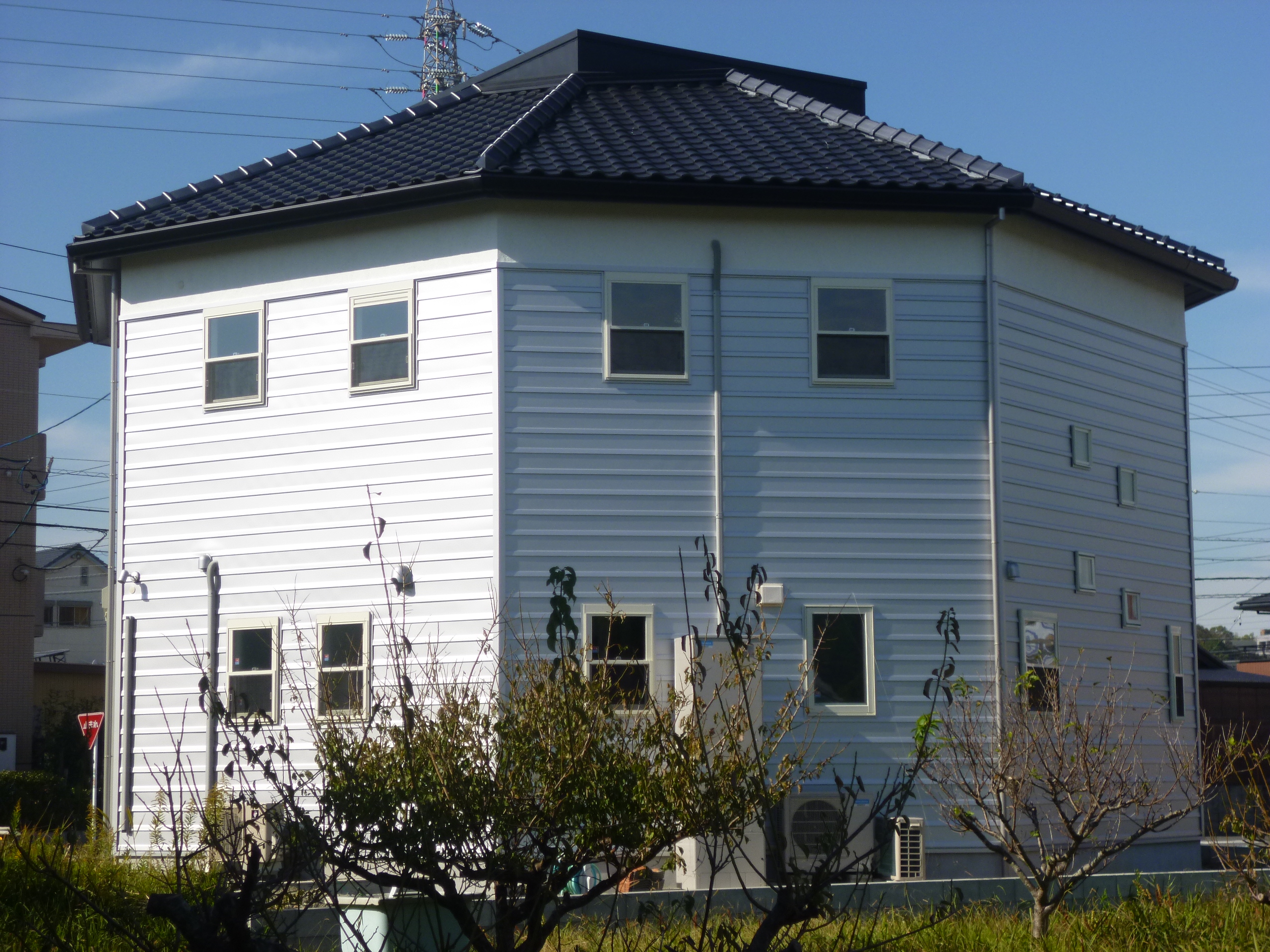 | 施工箇所 | 使用材料 | 材質 | 色 | ◆元請様のご自宅です。 元請様の前身は左官業でした。左官業と言う職業を超えての金属製の取り入れは、「自分の家に使うんだったら!」 の意見を正直に表現された結果だと思います。 ◆今までにない八角形の住宅を建てられ、その価値は未知数ですが、これからの新らしい価値観を創造出来る住宅として仕上りました。 ◆外壁の形状、色彩は奥様が選択され、モノトーンを基調に、シルバー色で施工しました。 ◆「住宅の価値は外観で決まる!!」 との言葉通り、お施主様の選択により、材質品質・デザイン形状・色彩の調和、の3つのポイントの大切さが分かる住宅となりました。 |
