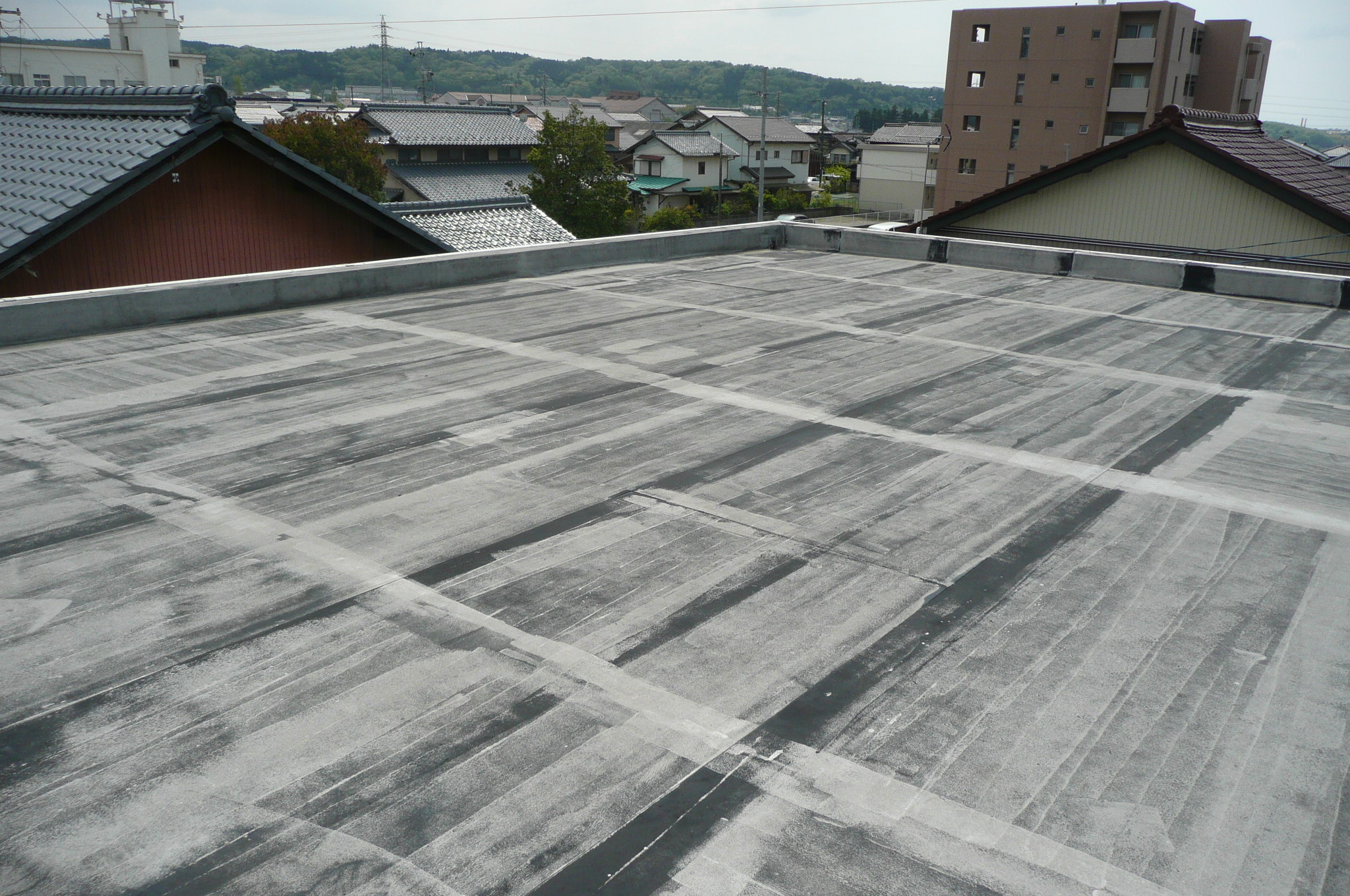| 施工箇所 | 使用材料 | 材質 | 色 | ◆築後20年程経過した建物の陸屋根です。 ◆最近、外壁の化粧タイルにひび割れが出来、雨漏りもするようになった。調べてみると、陸屋根部のシート防水もかなり劣化していたので、外壁工事と同時にタカウォーターブロックで改修することに決まりました。 ◆タカウォーターブロック防水は30年以上の実績があり、強靭性、耐水性、弾力性に優れています。古い防水シートを剥がし、FRPのライニング工法にて改修しました。 ◆お施主様は、上に上がって見られて、『継ぎ目もなく、きれいになるんですねぇ、これだったら屋根の上に大きなバスタブがあり、雨を全部受けてくれる。絶対に漏ることは無いでしょうね』 と、大変喜んでみえました。 |