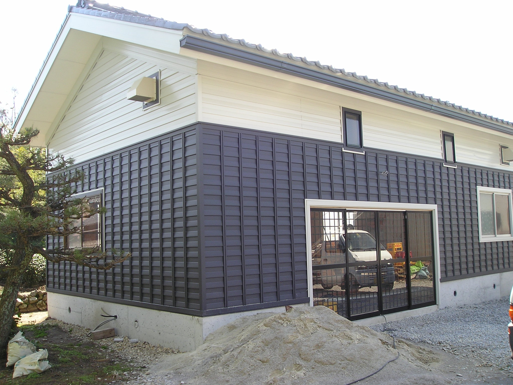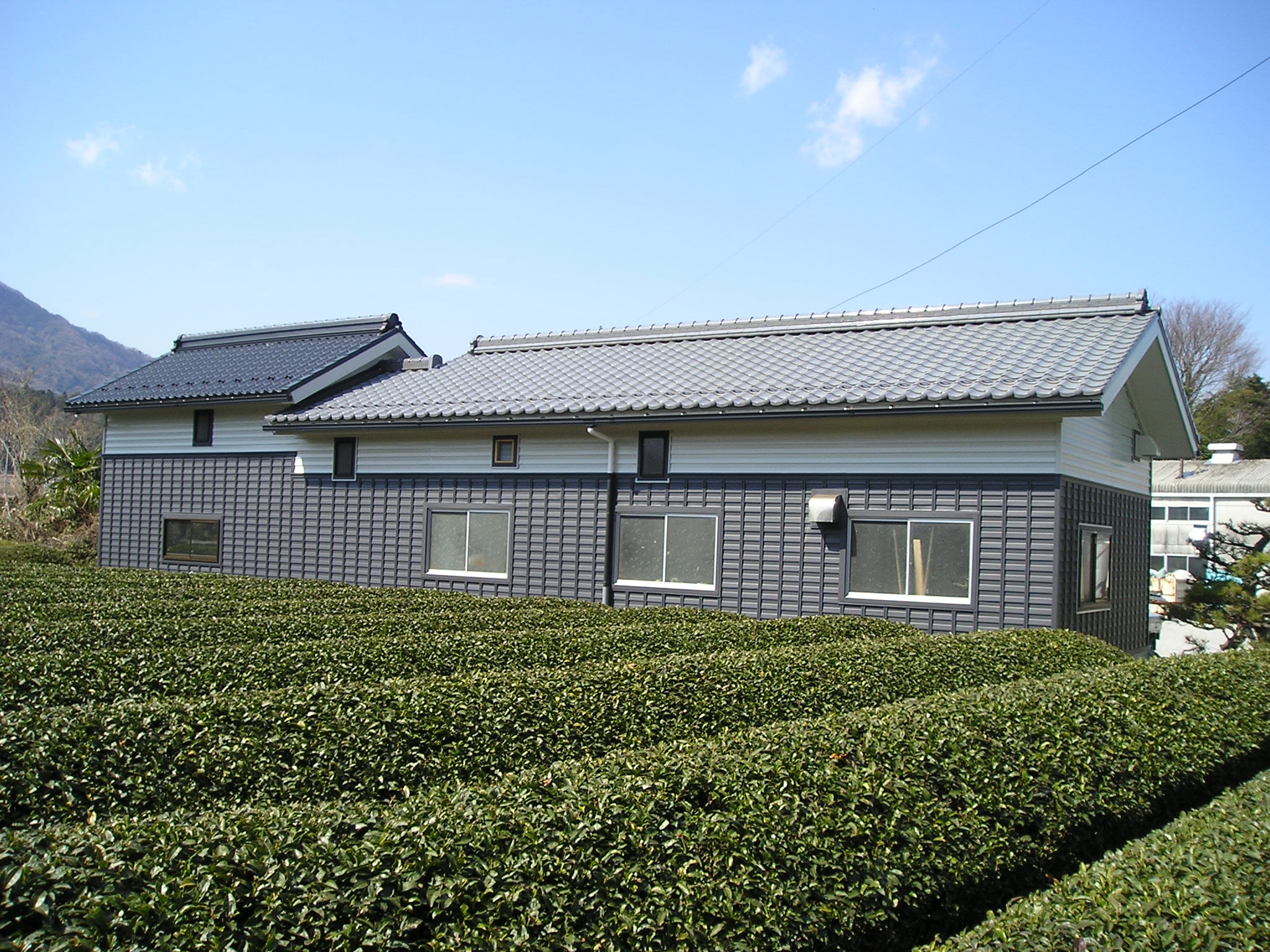 | 施工箇所 | 使用材料 | 材質 | 色 | ◆筑後50年の建物を移築し、“和” を生かした作業場に大変身! ◆移築にあたり、お施主様の要望も、「日本古来の白と黒の蔵風のイメージにしたい」 と、要望され、瓦屋根と途中取り替えたアルミサッシは、捨てるにはもったいないと再利用。屋根を除く外壁材は新しく取り入れ、新しく和風工場に生まれ代わりました。 ◆お施主様は耐候性、耐蝕性に優れたメンテナンスフリーのフッ素塗装鋼板 “エスフロン” をよく認識してみえ、外壁に採用いただきました。 ◆デザイン・色彩についても蔵をイメージするに最適な “ヨロイ張り” を選択されました。 ◆“もったいない” から始まった移築が、ファインスチールにより、理想の製茶加工場に大変身!お施主様も 「自分の思っていた通りに出来上がった」 と、大満足してみえます。 |
