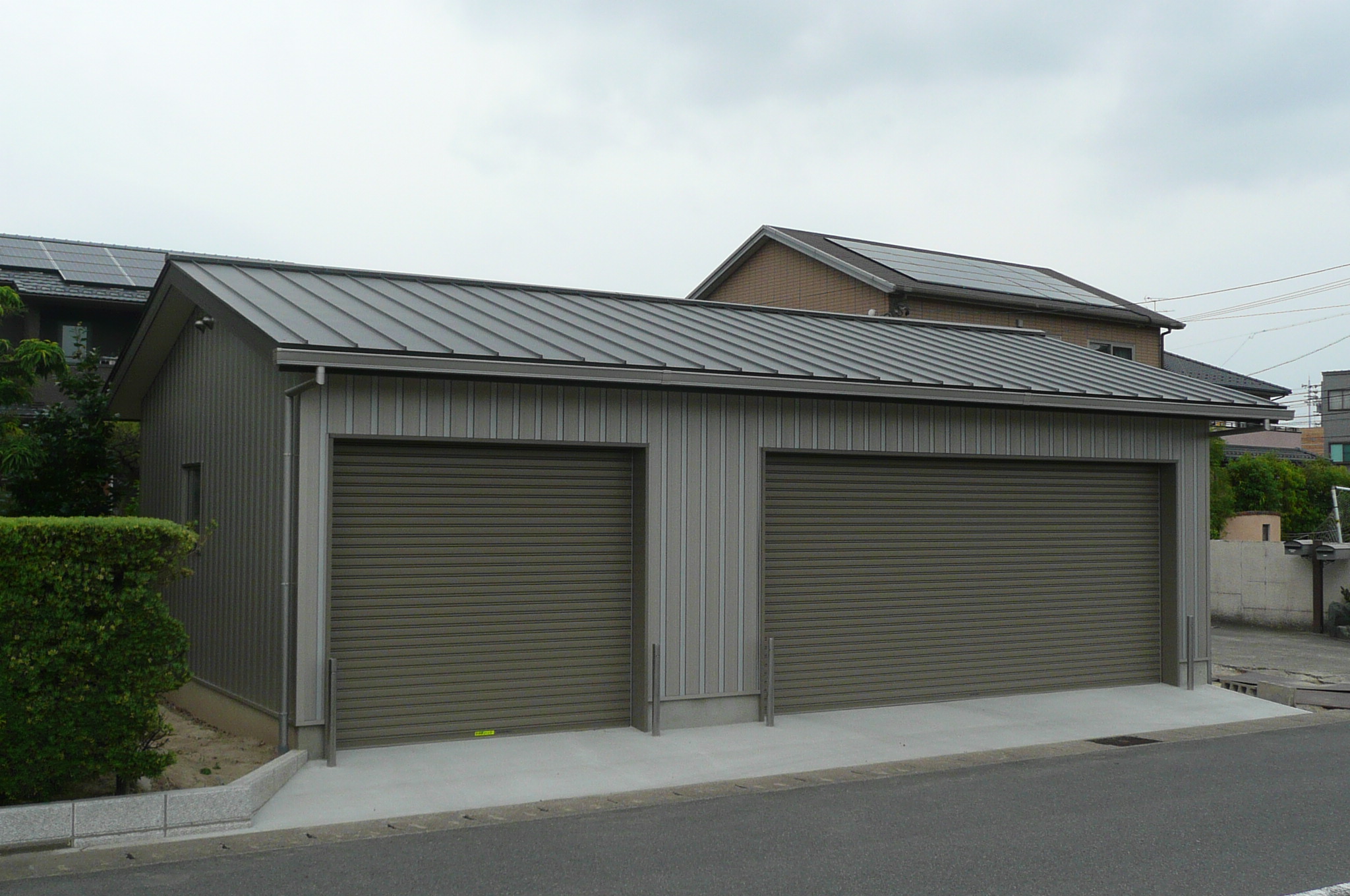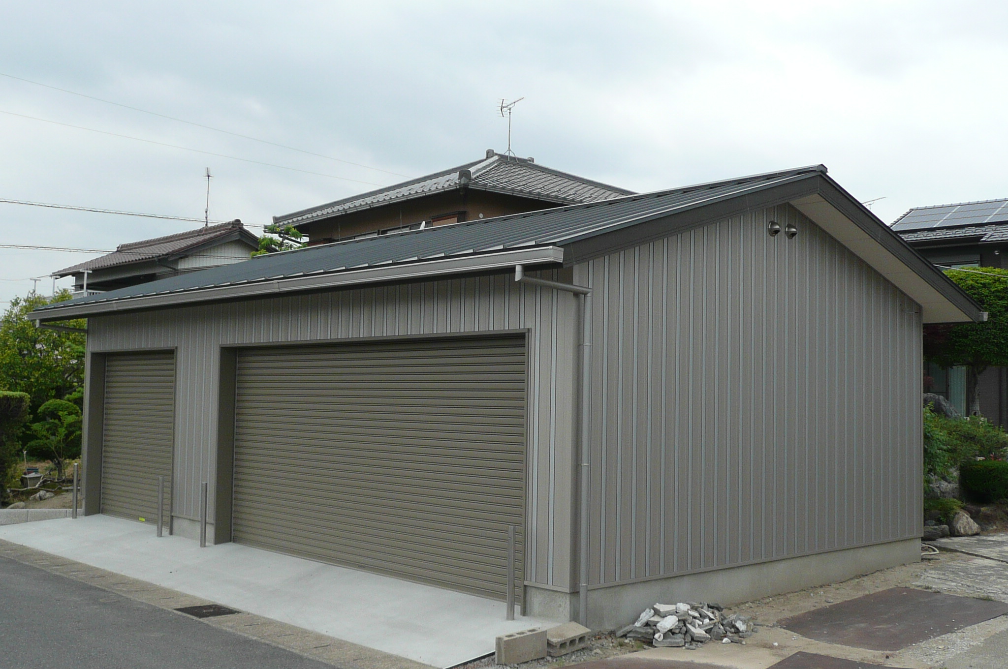 | 施工箇所 | 使用材料 | 材質 | 色 | ◆お施主様が車庫を造られるにあたり、敷地で一番目立つ場所になるため、外装を “どこにもないような仕上がりにしたい” との要望でした。 ◆また、金属製外装材が一番経済的で、その良さもよく理解されてみえ、形状については個性を活かしやすい “タカ角浪Z-1” を選択されました。 ◆色彩についても、よりオリジナル性を表現させるため、2色のストライプカラーに決められました。色はお施主様の好きな、よりメタリックが際立つディンプルカラーのサンシャインゴールドとシルバーを選ばれました。 ◆お施主様は仕上がりを見られ、「どこにも見たことの無い本当にオンリーワンの車庫が出来上がった!」と、大満足してみえます。 |